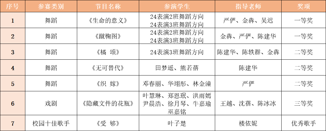 近日,2025年浙江省大学生艺术节落下帷幕。我校选送作品荣获一等奖2项、二等奖3项、三等奖1项、优秀歌手1项,学校获“优秀组织奖”,舞蹈节目《生命的意义》受邀在闭幕式晚会登台展示。