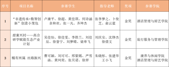 比赛中,酒店管理与厨艺学院团队通过药膳小笼包的创新研发与数智化升级,将药食同源的理念融入嵊州当地特色小笼包中,获嵊州市专项赛金奖;旅行服务与管理学院团队围绕开化县高合村丰富资源,开发特色研学课程包,获开化县专项赛金奖;康养与休闲学院、酒店管理与厨艺学院共建团队通过打造“丝瓜小镇”IP,开展美食研发、文创开发、举办节庆等,拓展产品销售渠道,获建德市专项赛金奖。