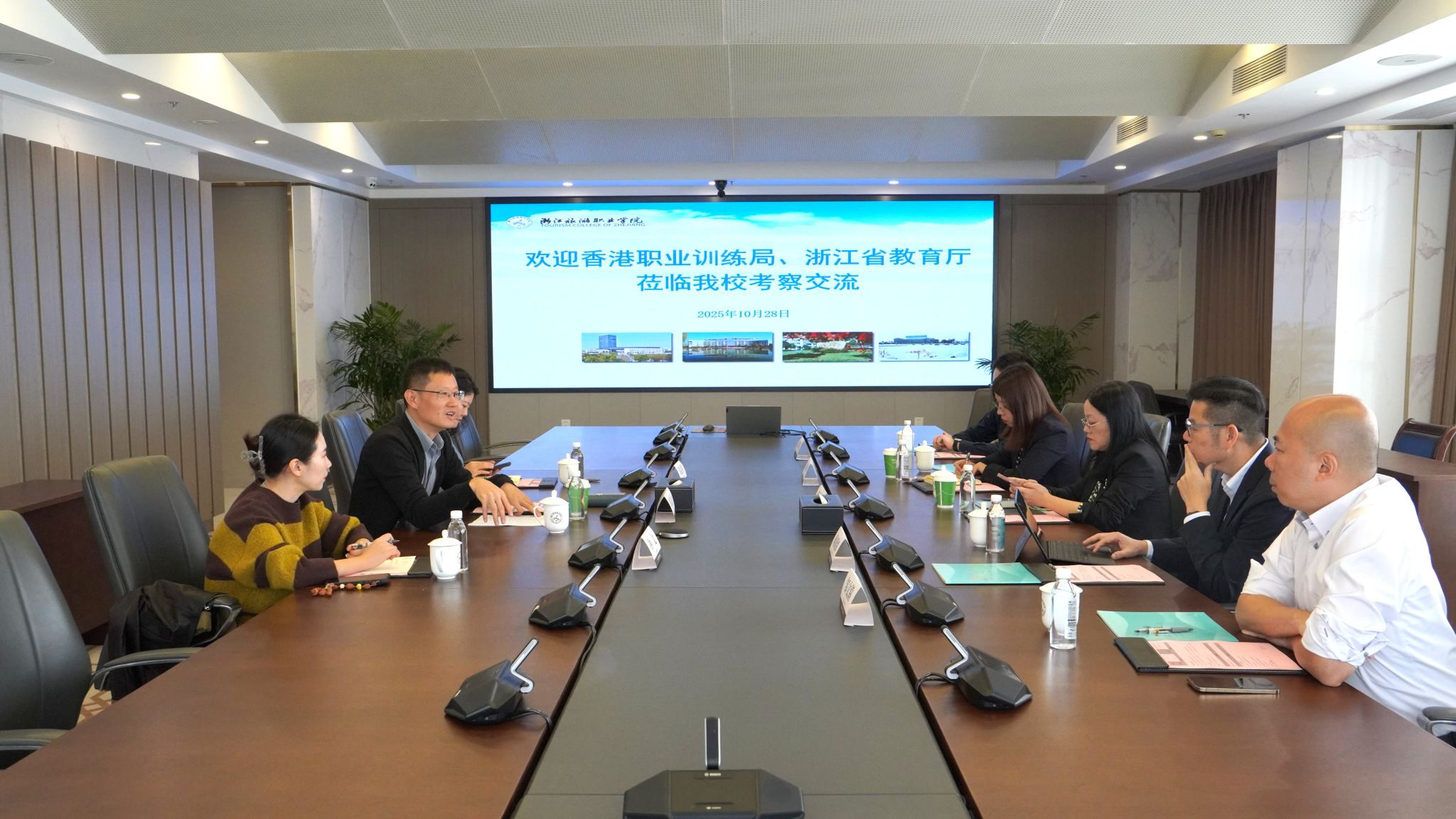 10月28日,浙江省教育厅港澳台办主任蓝晶晶一行2人,香港职业训练局工程学科项目经理赖韶细一行3人共同到访我校,围绕两地职业教育合作及浙港职业教育联盟建设展开深入交流。学校副校长郎富平及国际教育学院负责人共同参与座谈。