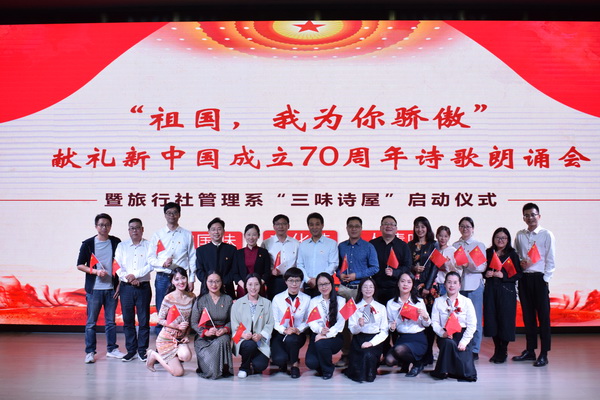 10月18日,我院旅行社管理系献礼新中国成立70周年诗歌朗诵会暨“三味诗屋”文化品牌启动仪式在缙云厅隆重举行。学院党委书记金炳雄、副书记周国忠出席,金炳雄为“三味诗屋” 揭牌,并为诗屋导师颁发证书。浙江省朗诵协会会长刘忠虎等协会嘉宾莅临指导。