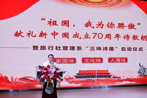 金炳雄在致词中表示,旅行社管理系党总支打造“三味诗屋” 党建文化品牌恰逢其时,此次结合“不忘初心、牢记使命”主题教育开展诗歌朗诵会则是一堂生动的创新思政课。金炳雄指出,用诗歌朗诵的方式向伟大祖国告白,表达对伟大祖国70周年华诞的祝贺,这不仅是一次关于声音的美育课程,也是一堂特别新颖出彩的思政课。金炳雄希望我院以此次朗诵会为契机,进一步加强全校师生的爱国主义教育和民族精神教育,弘扬中华优秀传统文化,展现时代气息,讴歌祖国壮美山河,激励广大师生不忘初心、牢记使命,砥砺前行,为实现中国梦而不懈奋斗。