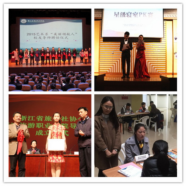 11月25日,校庆周活动高潮迭出,精彩继续。为进一步丰富教职工的业余生活,学院“教工之家”启用仪式当天举行,学院党委书记王昆欣、工会主席陆文出席仪式,各分工会教职工代表参加,据悉,“教工之家”将每周定期对教职工开放,并不定期地组织教职工举办集体活动。由学工部组织的2015阳光工程之星级寝室PK赛也于当天打响;酒店管理系举行了优秀校友“面对面”活动,以庆祝学院32周年华诞;旅行社管理系2015秋季实习招聘会顺利完成,该系近400名学生参加招聘会并被适合的岗位录取,部分优秀学生更是被多家企业争抢;浙江旅游职业学院导游协会成立仪式同步举行;学院教育基金会则在“519”艺术中心举办了 “杭州中旅励志奖学金、奖教金”颁奖典礼;外语系2016届毕业生实习就业招聘会在开元图书馆顺利举办;艺术系第一届校友导师计划暨2015艺术系“美丽领航人”校友导师聘任仪式举行。