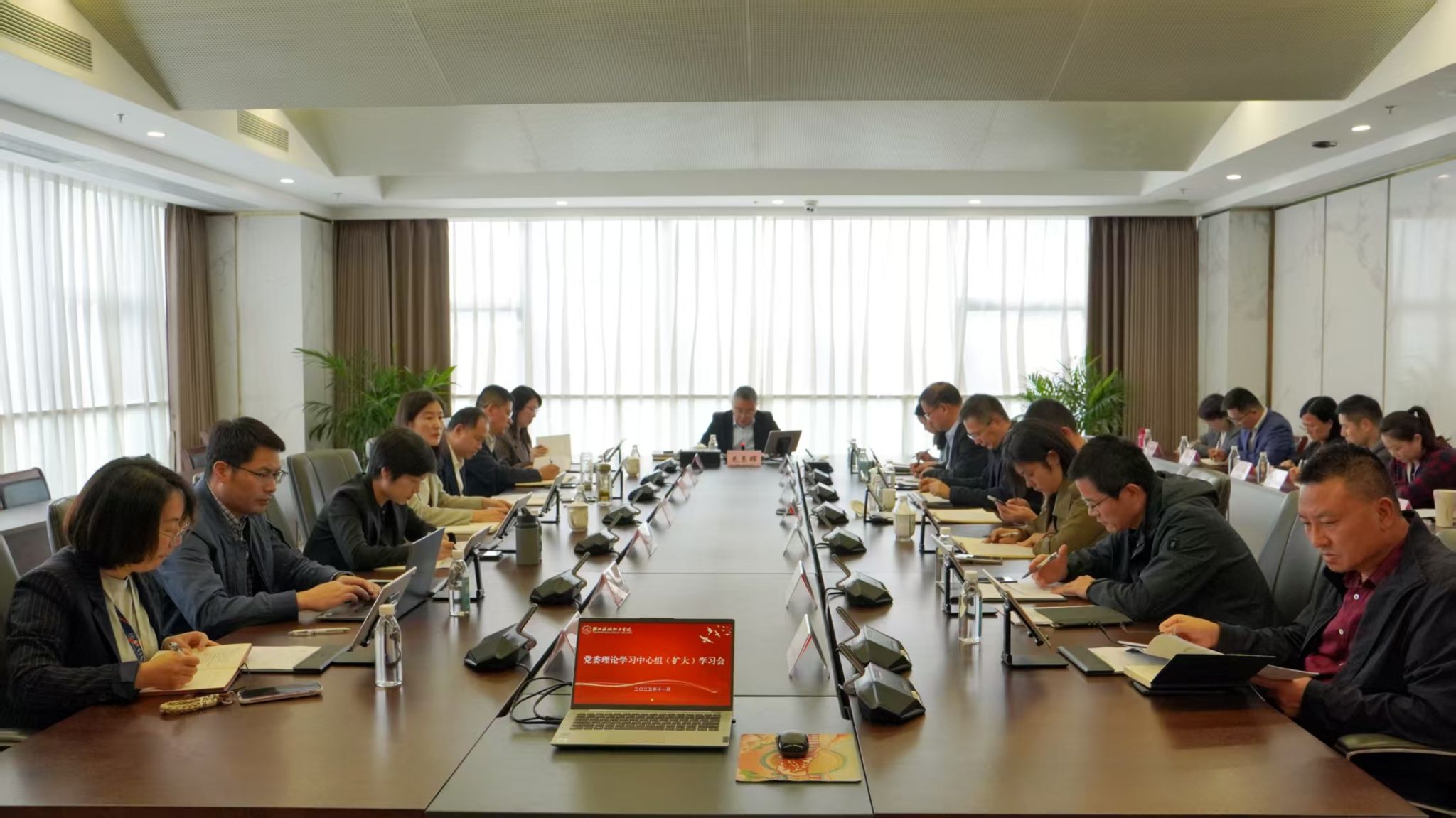 11月3日,学校召开党委理论学习中心组(扩大)学习会,专题学习“党的二十届四中全会精神”,围绕高质量贯彻落实党的二十届四中全会精神开展研讨交流。学校党政领导班子全体成员,办公室、发展规划处、教务处(产教融合办公室)、质量监控办公室负责人,二级学院党总支书记参加会议。党委书记毛东辉主持会议并讲话,浙江省教育厅干部人才处副处长周琼到会巡听旁听。