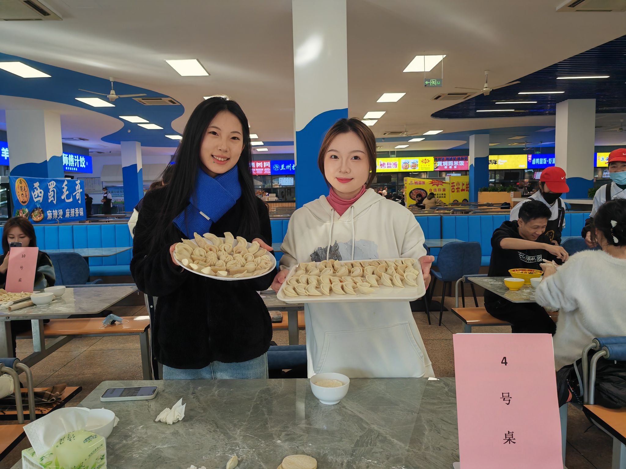 在北校区二楼食堂面点师傅的帮助下,同学们三五成群,围坐在桌子旁,大家分工协作,拌馅儿、和面、擀皮儿、包饺子,相互密切配合、有条不紊。包饺子的同学们一手拿起饺子皮,一手填饺子馅,双手合拢一捏,一个个的饺子就成型了,把浓浓的冬至情通通包进了圆鼓鼓的饺子里。