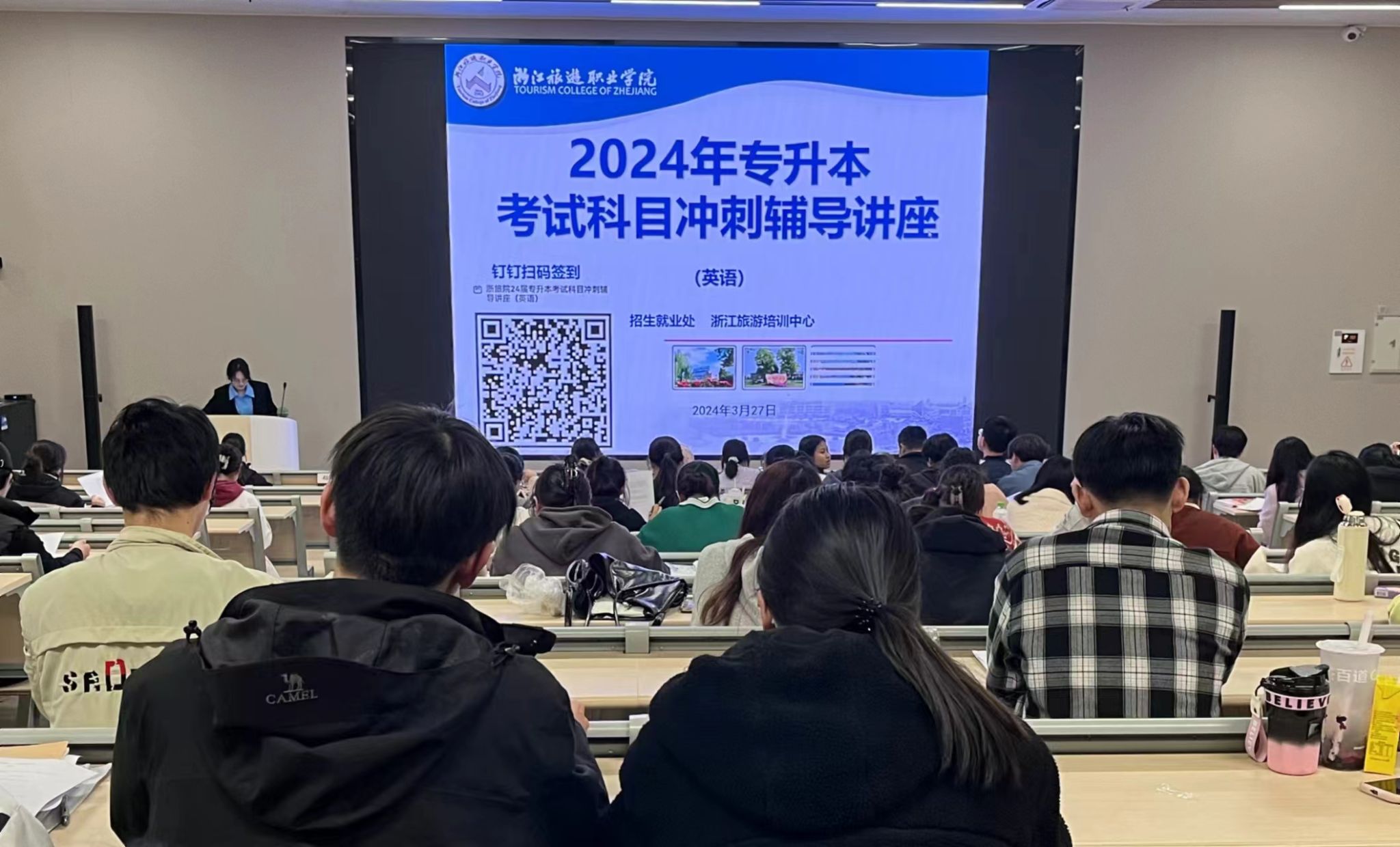 3月27日晚,学校招生就业处联合浙江旅游培训中心在明志楼开展2024届毕业生专升本考试科目冲刺辅导讲座,助力我校准考生们“拉满”冲刺速度,近200人次学生参加。